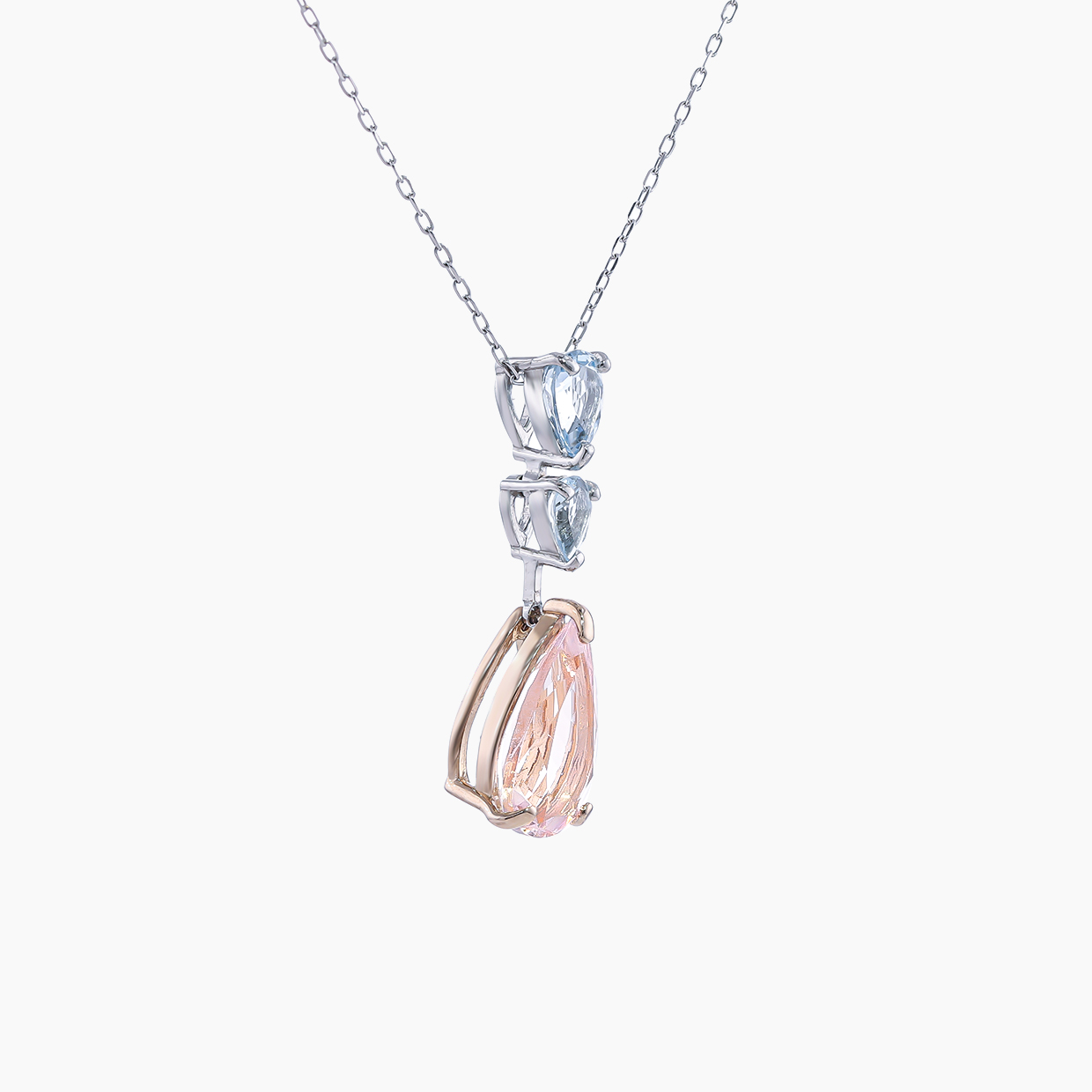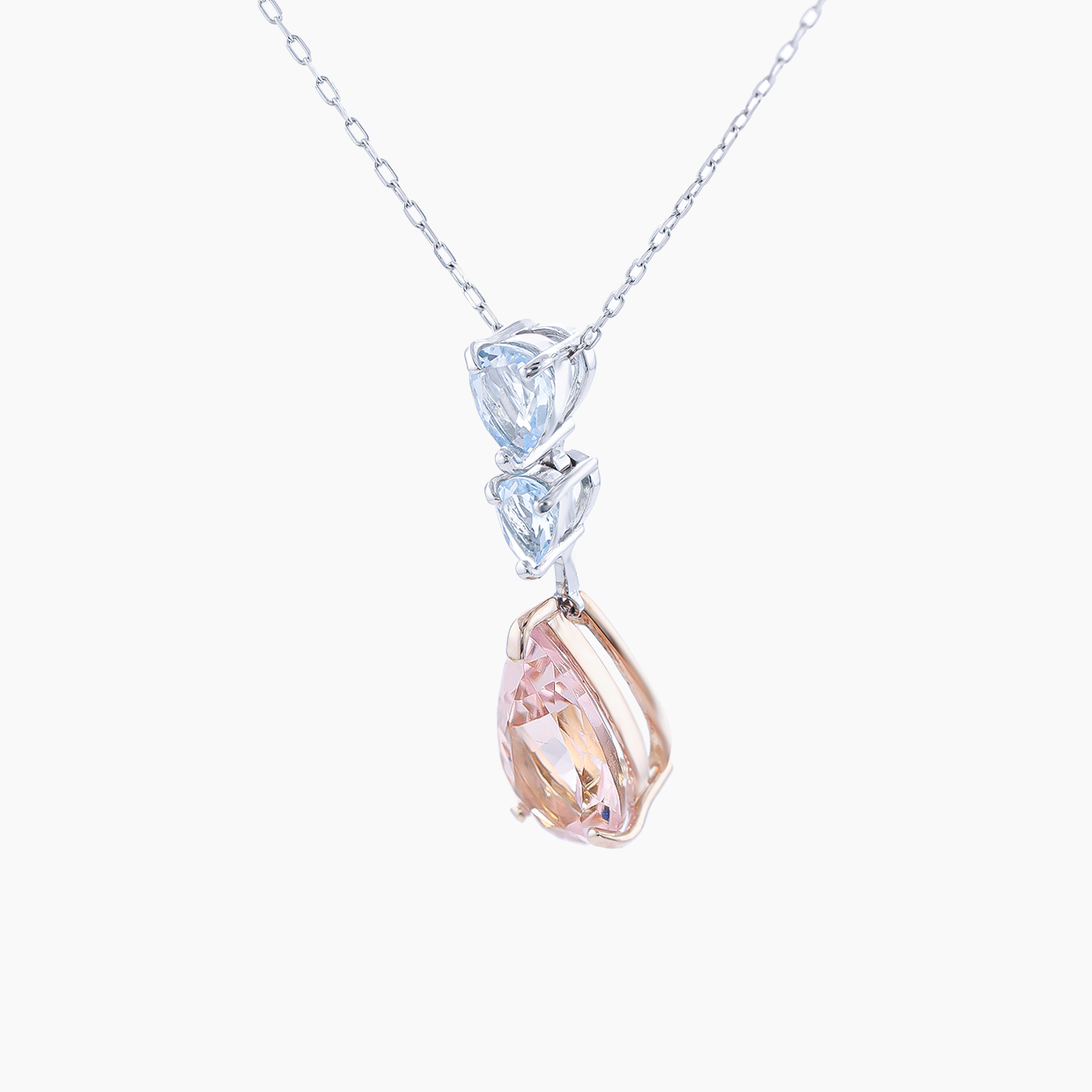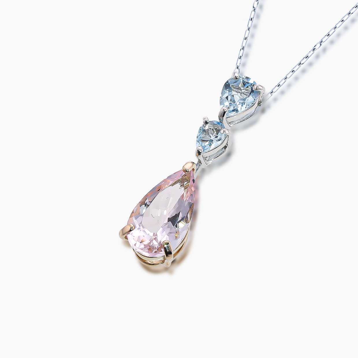 胸元で優しく揺れるペアシェイプのモルガナイトは、光を纏うたびにふんわりと柔らかなピンク色に光輝き、上品な輝きで彩ります。凝ったデザインはあえてせず、石そのものの良さが際立つようにしました。あなたの美しさに静かに寄り添い、魅力を引き立てます。「愛」、「清純」、「優しさ」の象徴であるモルガナイト。そしてその隣でそっと寄り添うようなアクアマリンは「幸福」、「富」、「若さ」をもたらすと言われています。