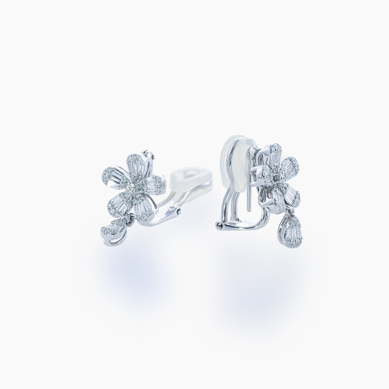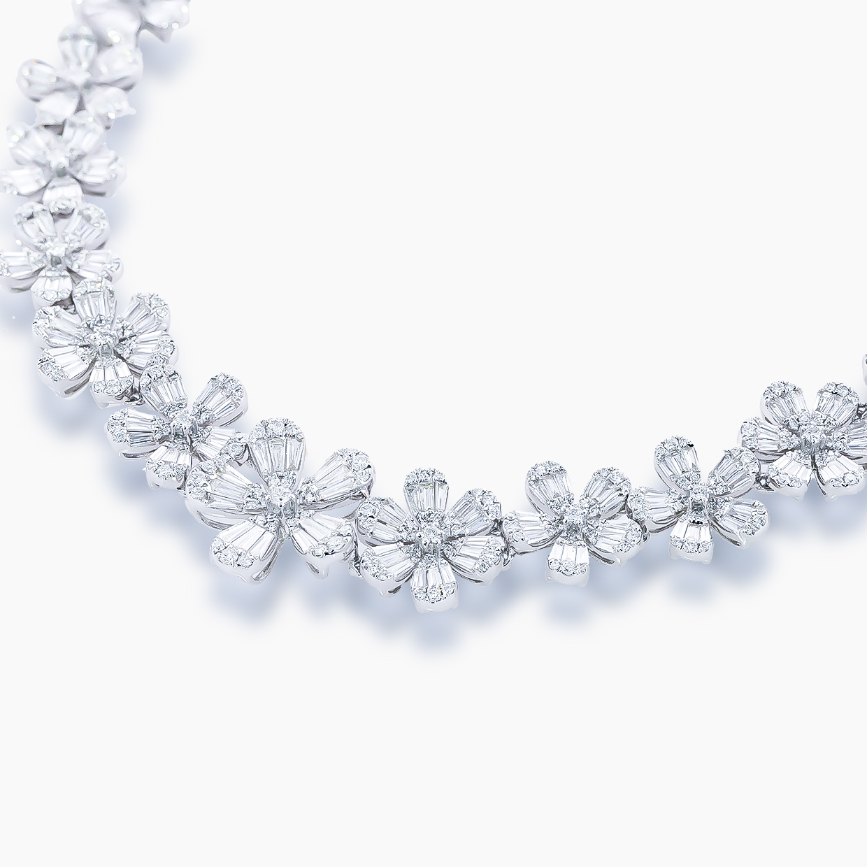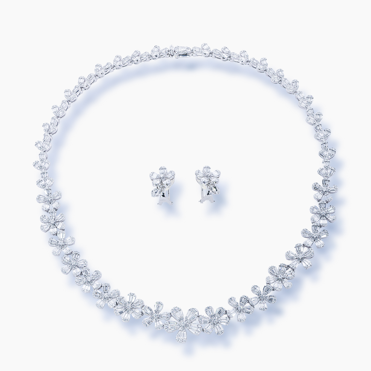 可憐な花々が咲き誇るようにセッティングされた、総計10ctアップのダイヤモンドを贅沢にあしらったネックレスとピアスのセットです。厳選されたバケットカットとラウンドカットのダイヤモンドを組み合わせ、立体的なフラワーモチーフを描くことで、繊細さと華やかさを同時に表現しました。光を受けるたびにきらめくダイヤモンドは、まるで光の花冠のようにデコルテを包み込み、耳元には気品ある輝きを添えます。洗練されたフォルムと贅沢な煌めきは、格式あるパーティーや式典、ブライダルシーンにふさわしい存在感を放ち、女性らしい優雅さを際立たせます。永遠の輝きを宿したこのジュエリーは、特別な一日をよりいっそう輝かせる、タイムレスな逸品です。