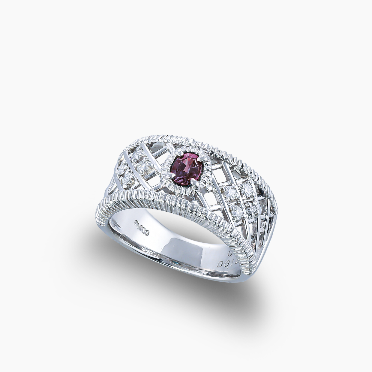 神秘的な輝きを放つ0.28ctのアレキサンドライトを主石に据えたリングです。アレキサンドライトは、光源によって表情を変え、希少石ならではの奥深い魅力を備えています。周囲には合計0.16ctのダイヤモンドが上品に煌めき、指先に華やかさを添えています。幅広いプラチナのアームには職人技が光る繊細な格子状の透かし彫りが施されています。重厚感がありながらも、軽やかで上品な抜け感を演出し、希少性とデザイン性を兼ね備えた特別な一品です。