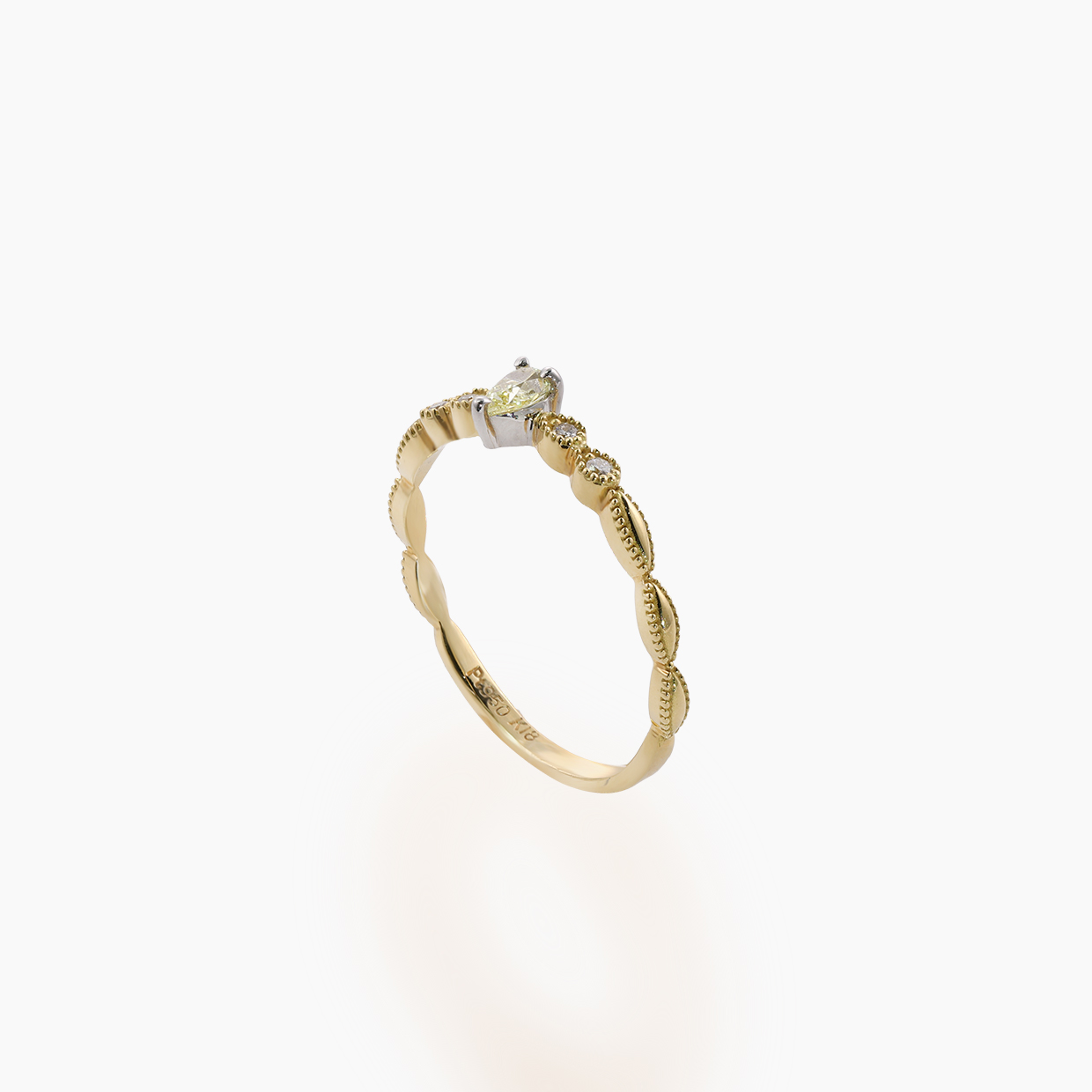 中央に配されたペアシェイプのイエローダイヤモンドは、陽の光を閉じ込めたかのような温かみのある輝きが魅力です。職人の手仕事を感じさせる細やかなミルグレインを施し、クラシカルな表情に仕上げました。また、サイドに並ぶメレダイヤモンドが、センターのイエローダイヤモンドをより一層鮮やかに引き立て、指先を明るく彩ります。細身のアームでお手持ちのリングと重ね着けもしやすく、幅広いシーンでご愛用いただけます。