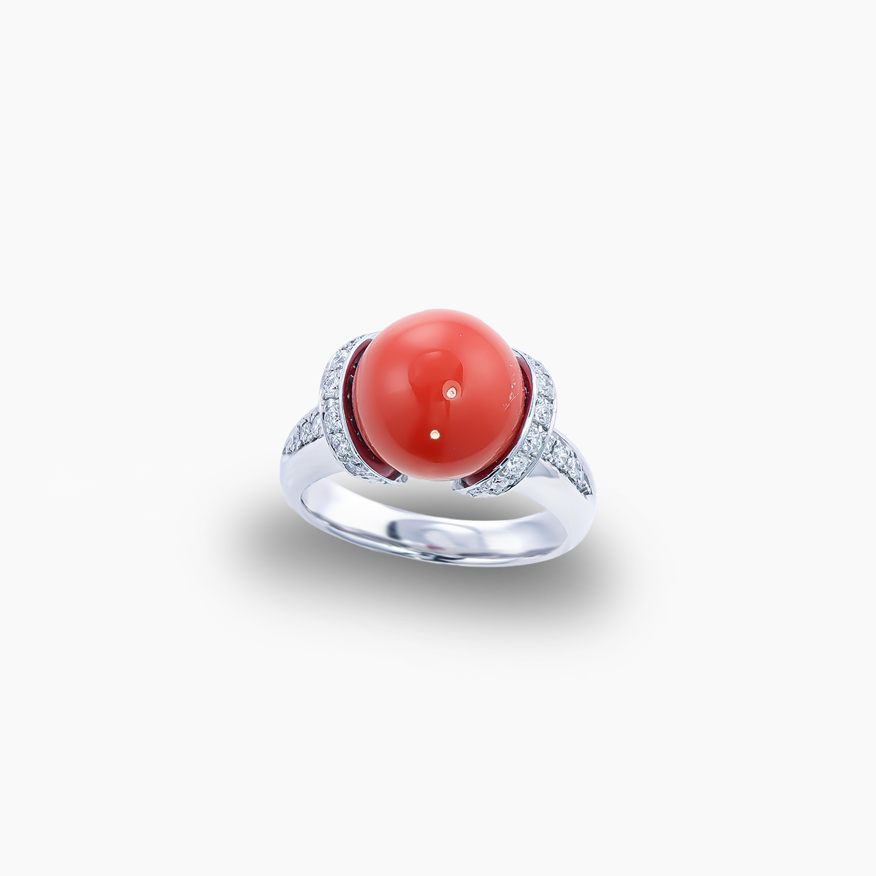 海の恵みが育んだ、直径10.3mmの大粒の丸玉サンゴをメインストーンに据えた贅沢なリングです。優しいオレンジを含んだあたたかな赤色が魅力で、その生命力あふれる色彩を、優雅な曲線を描く合計0.32ctのメレダイヤモンドの煌めきがいっそう引き立てます。近年ますます希少価値が高まるサンゴの中でも、10mmを超える丸珠は特に入手が難しく、コレクションピースとしての価値も十分。古来より「不老長寿」や「幸福」を象徴する縁起のよい宝石として愛されてきたサンゴは、指元に品格と温もりをもたらしてくれます。サンゴの深みある赤とダイヤモンドの上質な輝きが見事に調和し、和装にも洋装にも映える特別な華やかさを演出。世代を超えて受け継がれるにふさわしい、気品あふれる至宝のリングです。