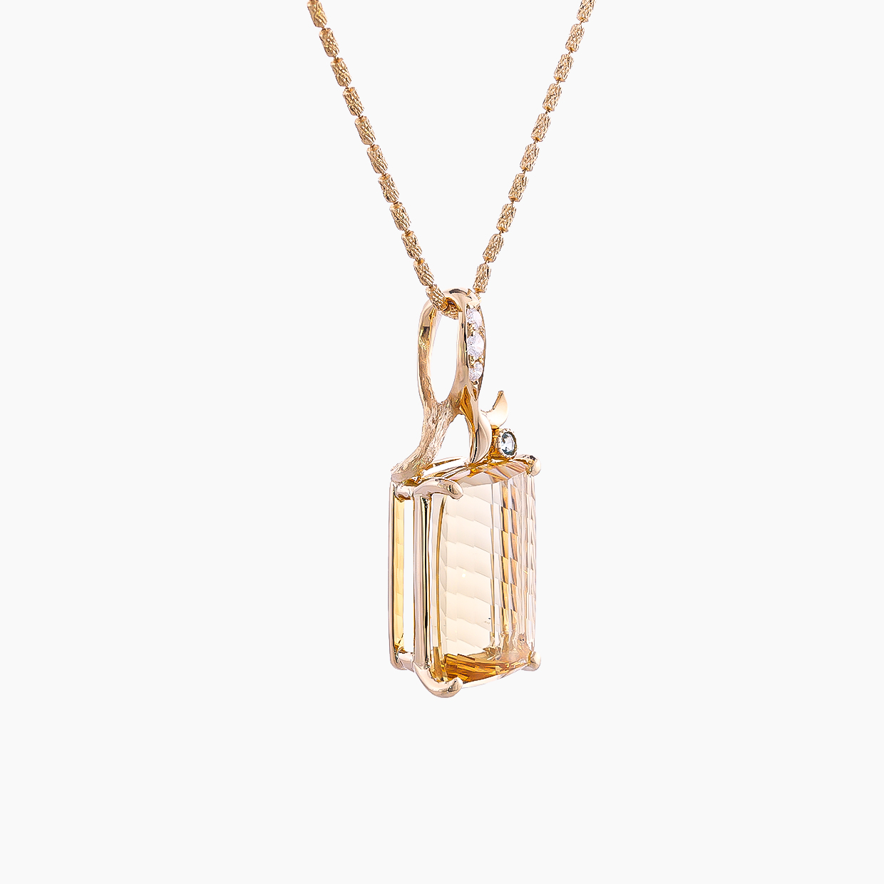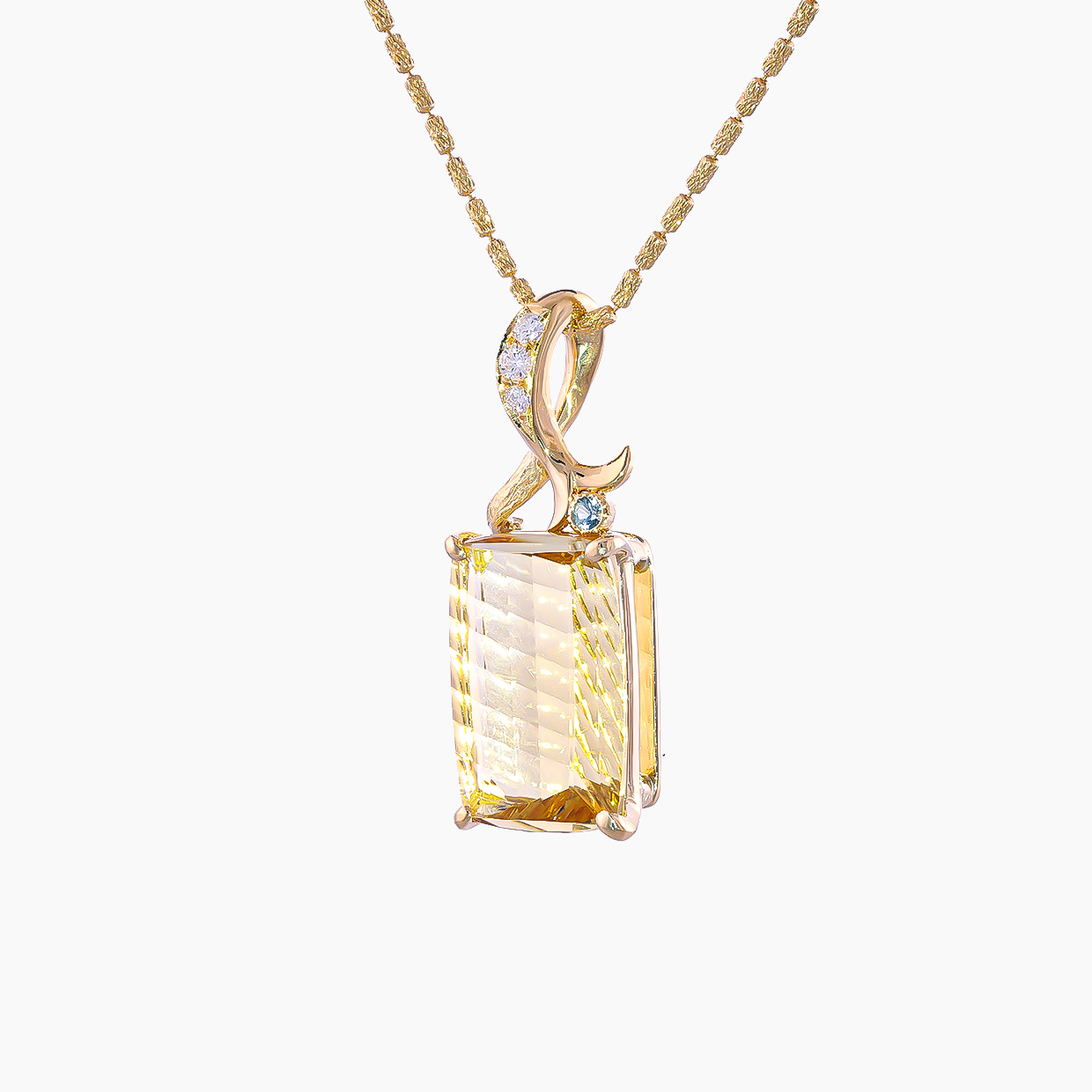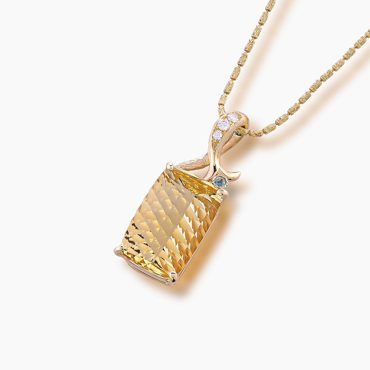 K18ベリルペンダント 太陽の贈り物 陽ざしのような温かさで胸元を照らすペンダント 石の裏側からカッティングされたゴールデンベリルは石の内側から輝く光と反射する光が相まって、キラキラ感を堪能できます。柄物のお洋服の上にあっても存在感を示し、黄色の石にありがちなお肌の上で沈む事もありません。添えたサファイアはブルーグリーンのニュアンスカラー。ベリルに寄り添うお色目です。 K18ベリルペンダント K18 ベリル:10.501ct ダイヤモンド:0.06ct サファイア:0.04ct 品番:116818 価格:¥539,000(税込) こちらを下見する 商品一覧へ