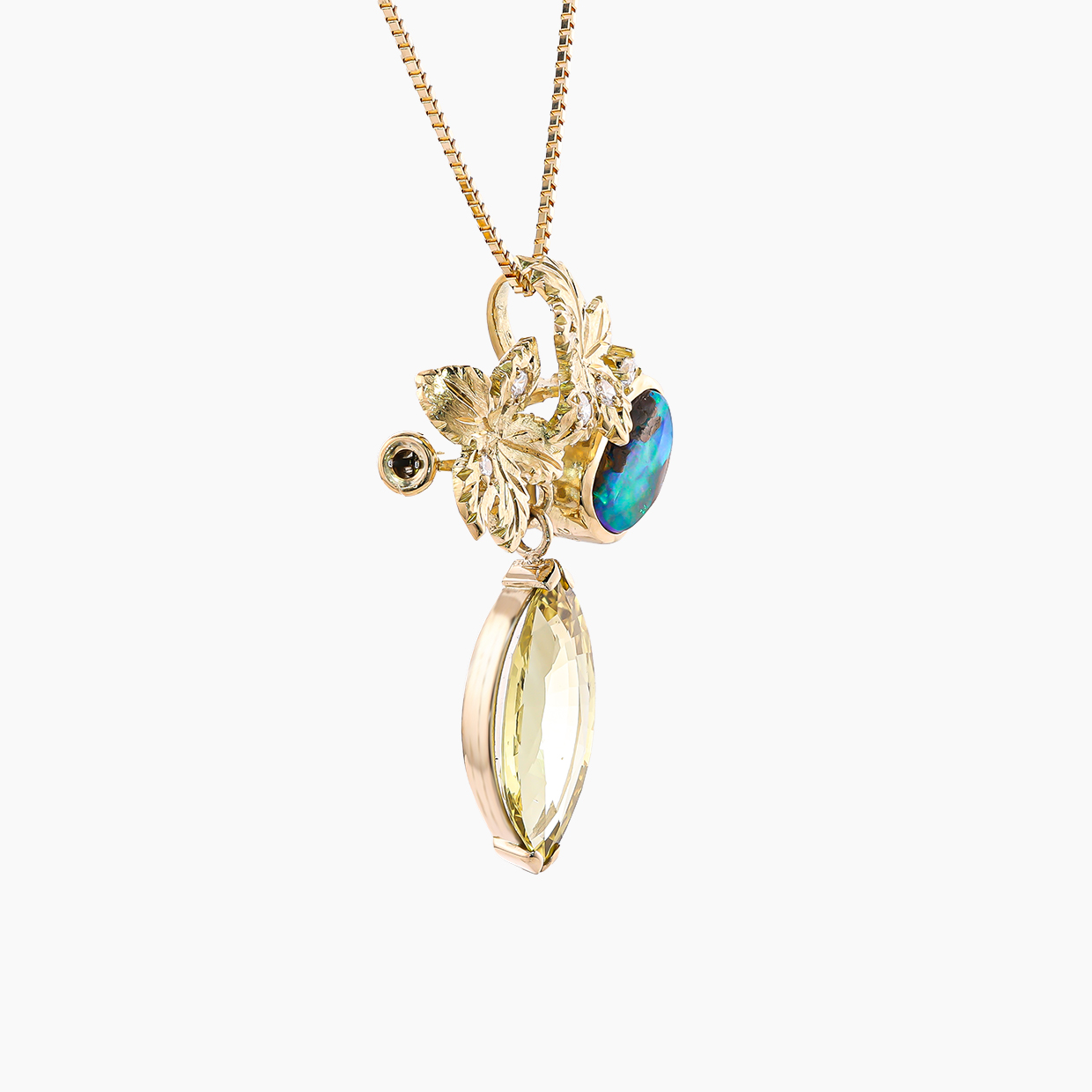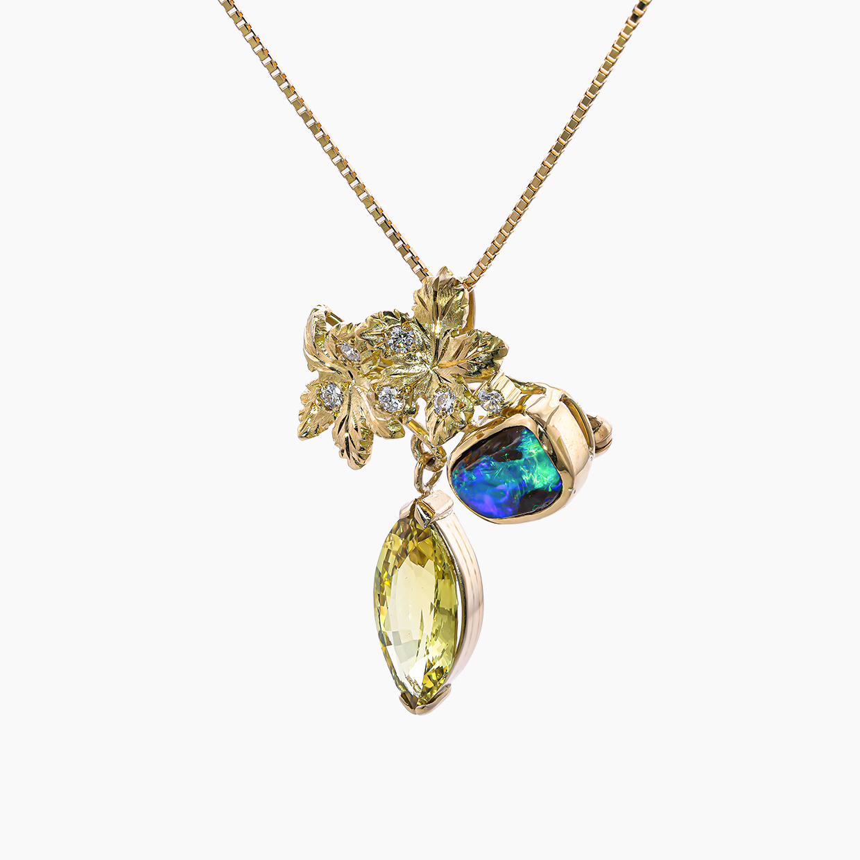 K18ボルダーオパール/イエロージルコンペンダントブローチ 移り行く季節 夏の余韻に包まれて紅葉が湖を取り巻き夕陽がきらめきながら静かに沈む景色を思い描きました。「金剛光沢」と呼ばれるダイヤモンドに見られる特徴的な輝き方をするイエロージルコンを夕陽に、そして遊色効果が魅力のボルダーオパールを湖に見立てました。ゆらゆらと動くイエロージルコンが時の流れを感じさせてくれます。 K18ボルダーオパール/イエロージルコンペンダントブローチ K18 イエロージルコン:2.98ct ダイヤモンド:0.11ct ※チェーン別売 品番:117075 価格:¥380,000(税込) こちらを下見する 商品一覧へ