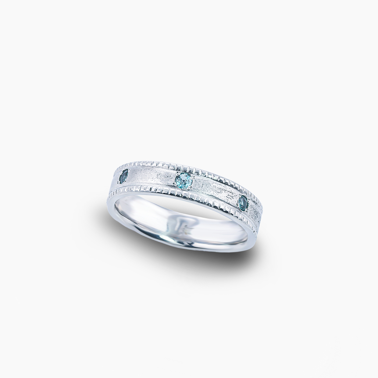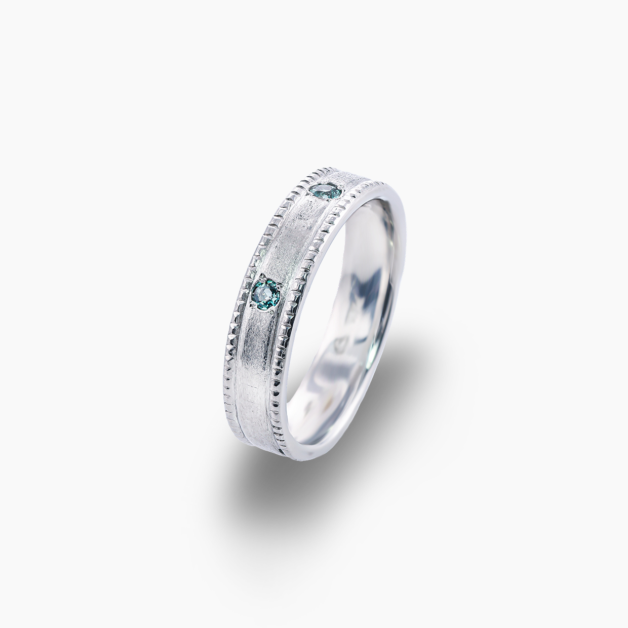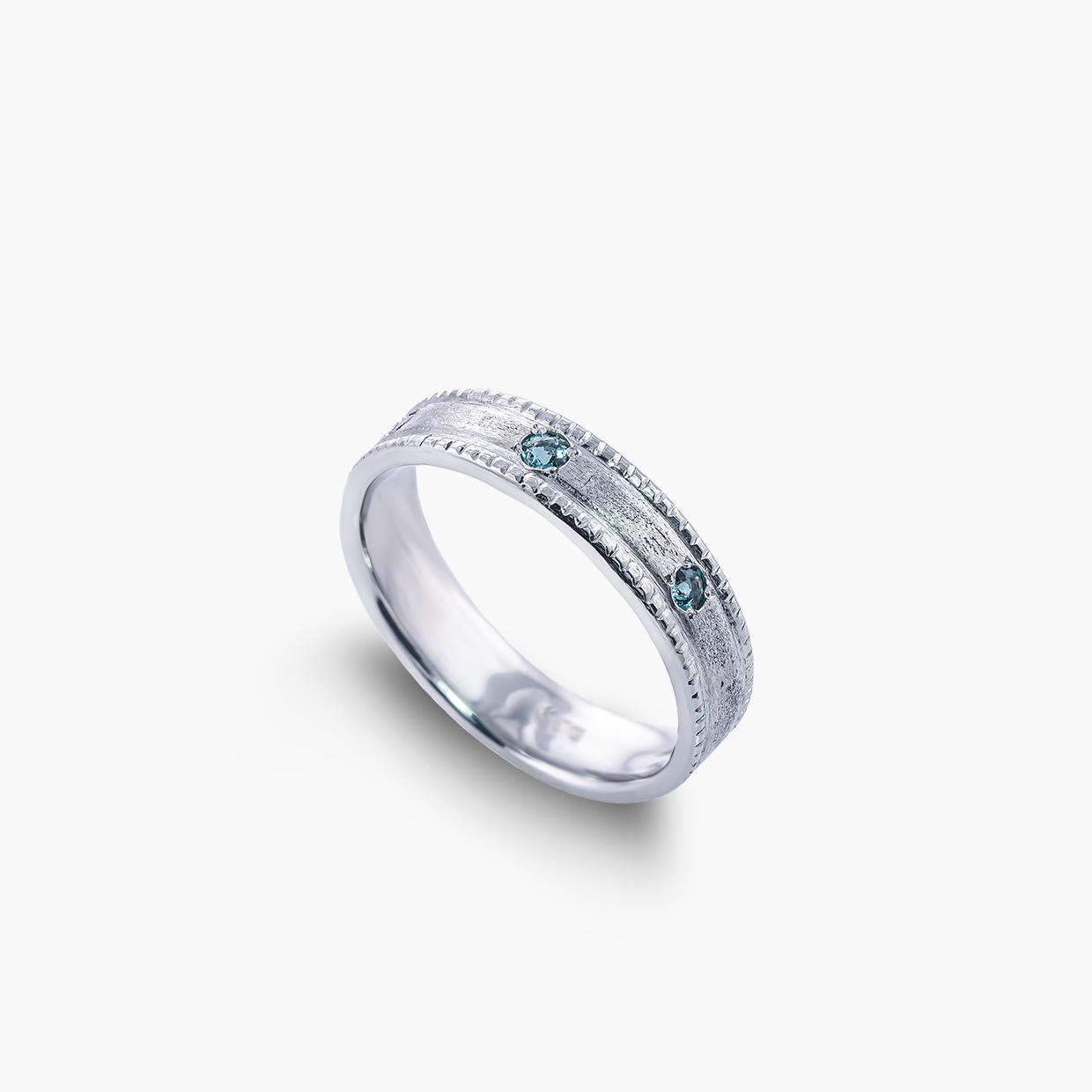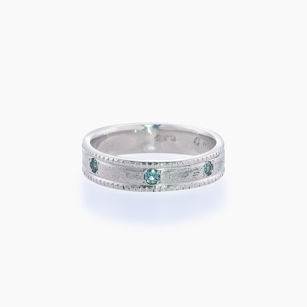光によって表情を変える3石のアレキサンドライトを、贅沢にあしらったプラチナリング。昼の太陽光の下では穏やかな青緑に、夜の灯りの下では神秘的な赤紫へ――その変化はまるで、光が紡ぐ物語のようです。「トリロジー」とは、三つの宝石で“過去・現在・未来”を象徴するデザイン。大切な想いを時を越えてつなぐ、永遠の絆の証として愛されてきました。プラチナのマットな質感と、側面に施された繊細なミル打ち装飾が、アンティークの趣と気品を添えます。厳選されたアレキサンドライトは伏せ込みで丁寧にセッティングされ、日常の装いにも自然に溶け込む上質さを備えています。クラフトマンシップが息づくミル打ちとプラチナの質感が、手元を知的で上品に彩り、光とともに、永く寄り添う一本として輝きを放ちます。