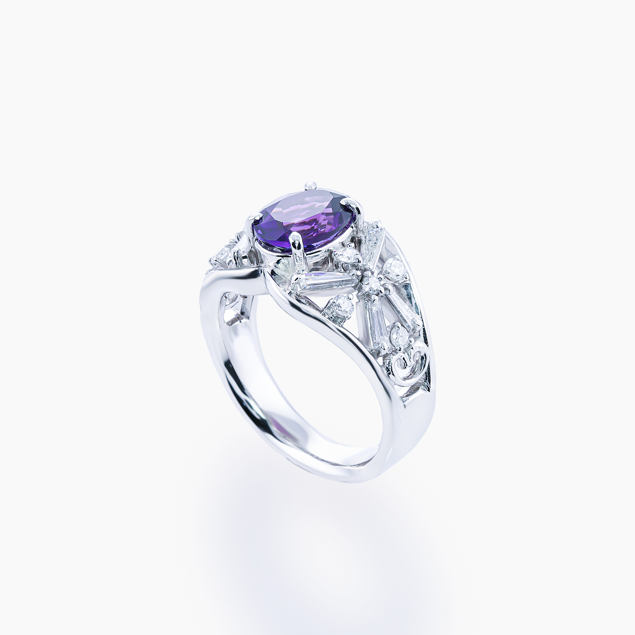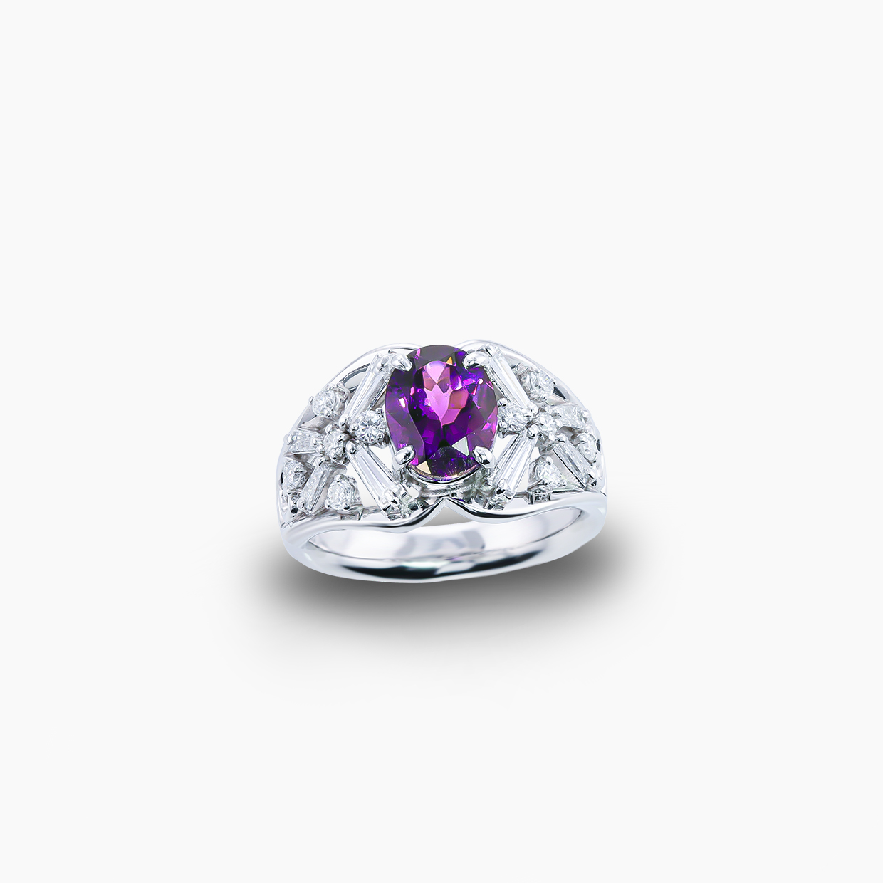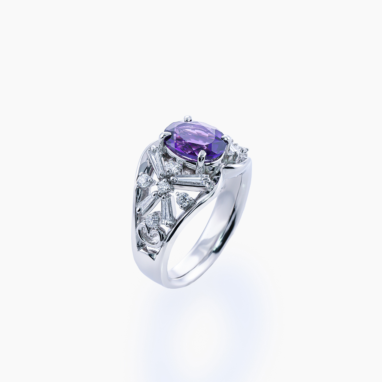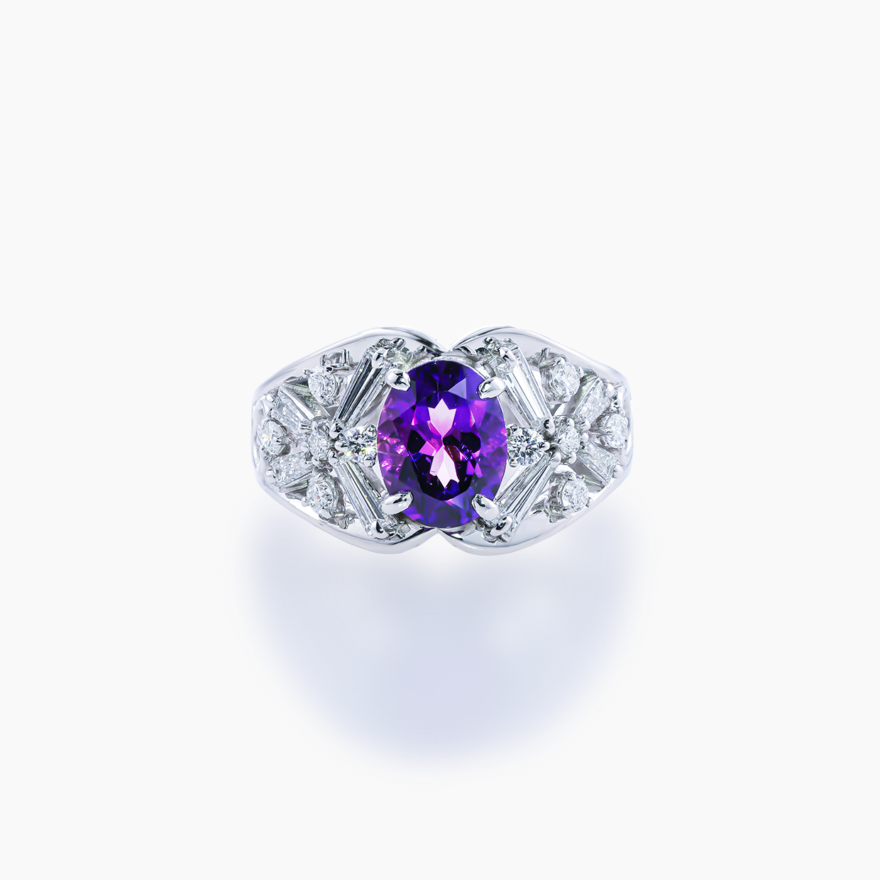 日を浴びて輝く葡萄色の、1..61ctと大粒のアメシストリングです。古代より愛と真実を象徴する石として知られ、王族や司祭の間で高貴な石として珍重されてきました。このアメシストの吸い込まれるような深みのある鮮やかな紫色は、水晶に鉄が微量に含まれることで生まれます。神秘的で上品な雰囲気をもつアメシストは、身に着ける人を一層魅力的に見せてくれます。脇を彩るダイヤは空間を活かして華やかに仕立てて、すっきりとした輝きのテーパーカットダイヤと、小粒でもキラキラと輝くラウンドブリリアントカットダイヤを使って花模様を作りました。ダイヤの間から肌が透けて、ボリュームの割に軽やかな印象です。アメシストの石言葉は「誠実」「心の平和」「高貴」。結婚17年目の記念の宝石でもあります。パートナーへの日々の感謝の気持ちを宝石に託して贈るのも素敵ですね。