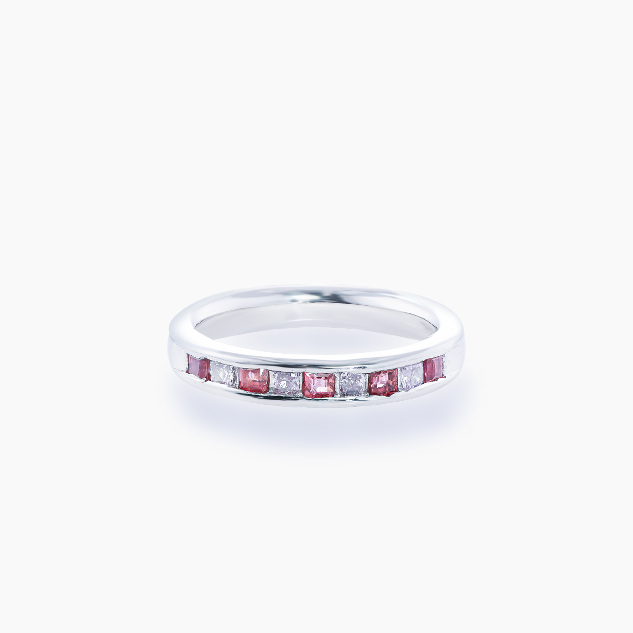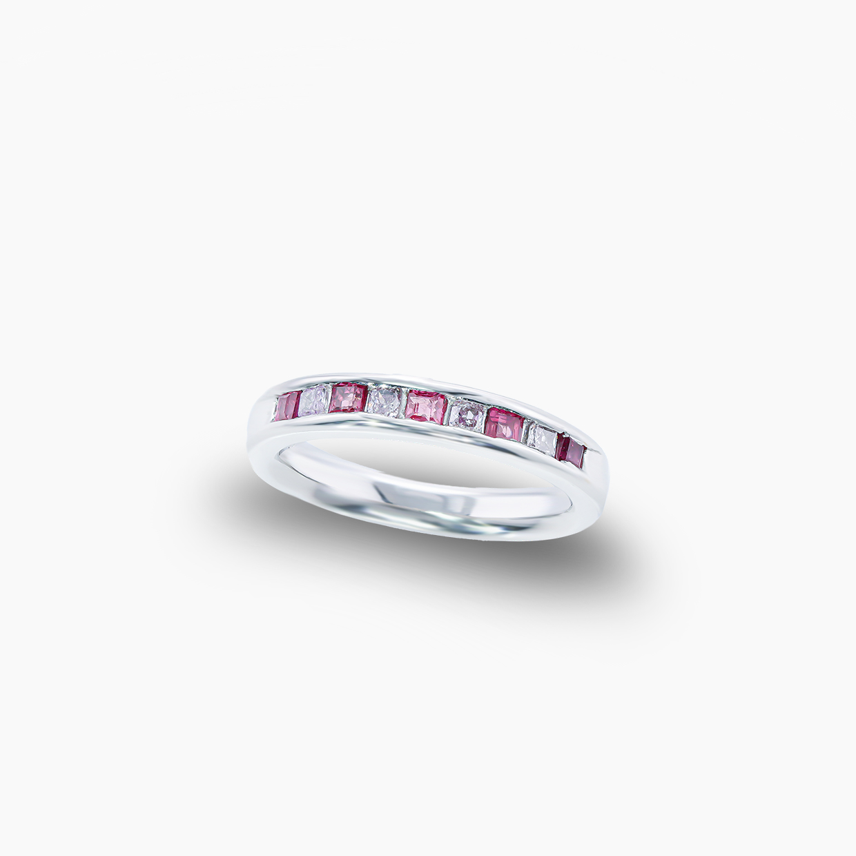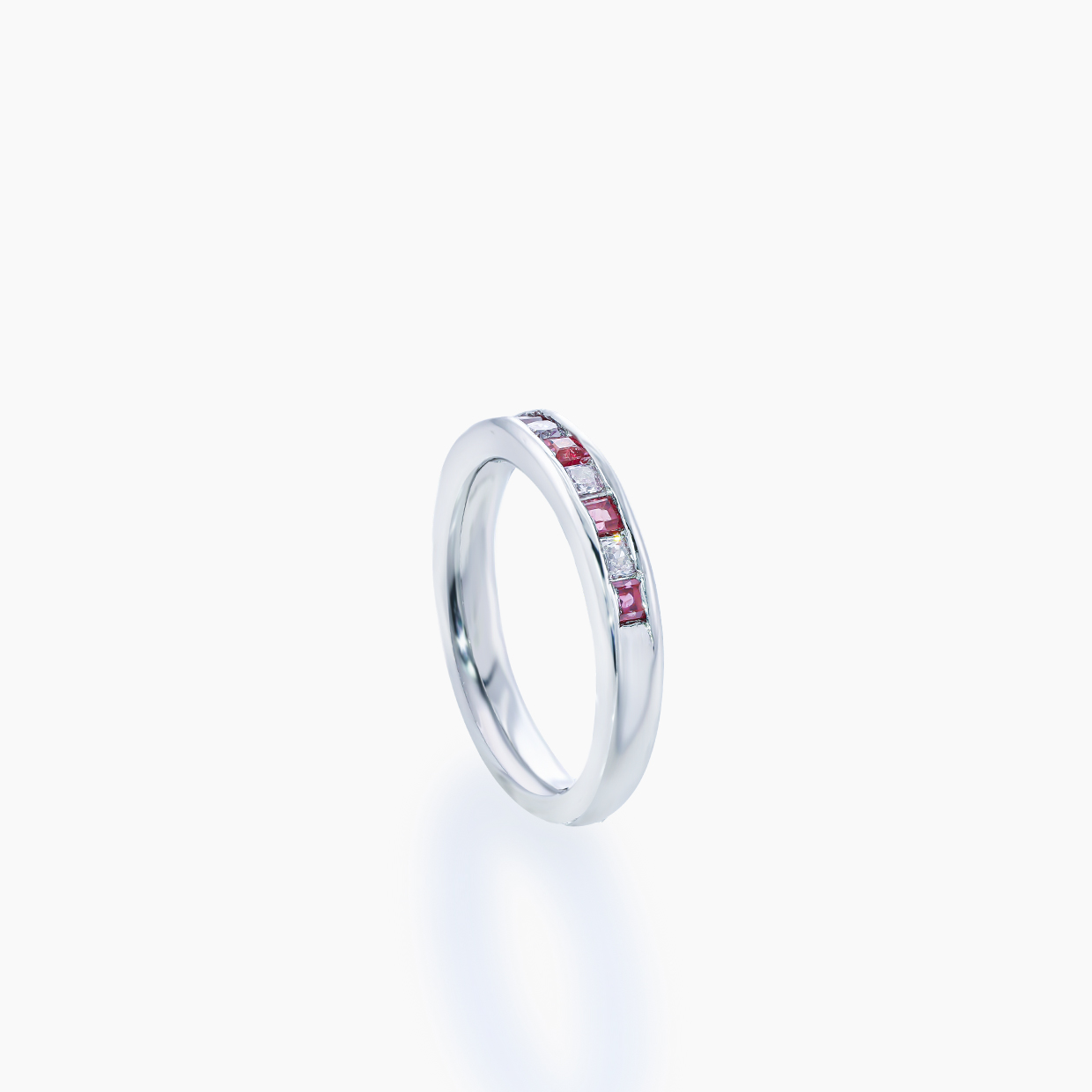 華やかなルビーと希少なピンクダイヤモンドが交互に煌めく上品で贅沢なハーフエタニティリングです。ルビーの鮮やかな赤が情熱を、ピンクダイヤモンドの淡い色合いが永遠の愛と幸福を象徴し、途切れることのない宝石の輝きが永遠の絆を指先に宿し、正面からの煌めきとプラチナの滑らかな着け心地が調和する、手元に特別な物語を添えます。ピンクダイヤモンドは世界中で採掘されるダイヤモンドのうち、 0.01%未満 とされます。また主要鉱山であるオーストラリアのアーガイル鉱山が2020年に閉山したため、その稀少価値はますます高まっており、お気に入りのピンクダイヤモンドとの出会いはまさに奇跡と言えるでしょう。レール留めのシンプルなデザインは、引っかかりも少なく、硬度の高い石を使用しているため普段使いから大活躍のリングです。