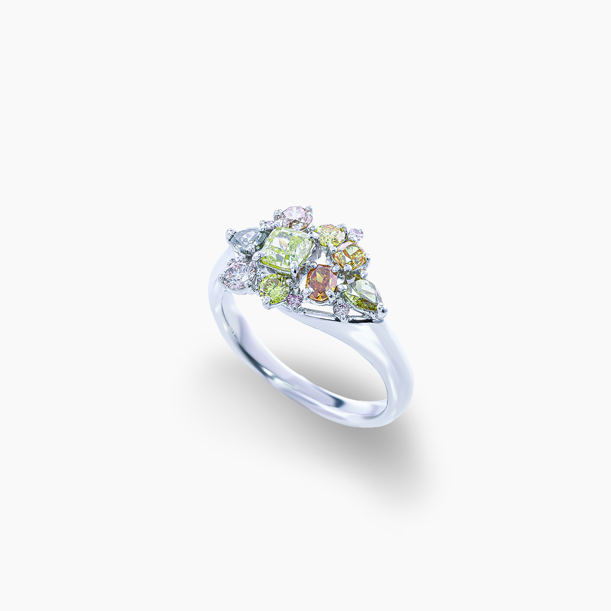 多彩なカラーとシェイプのカラーダイヤモンドを贅沢にあしらった、まるで万華鏡のように輝くリングです。瑞々しいイエローは「希望」と「富」を象徴し、温かみのあるオレンジは「創造性」と「情熱」を引き出します。希少なピンクは「愛情」と「優しさ」を表し、落ち着いたブラウンは「包容力」を、爽やかなグリーンは「調和」「再生」「繁栄」を象徴するといわれています。光の角度によって表情を変えるダイヤモンドのきらめきが、指先に唯一無二の存在感を与え、見るたびに新たな発見と感動をもたらします。このリングは、あなただけの物語を紡ぎ人生の輝かしい1ページを彩ります。
