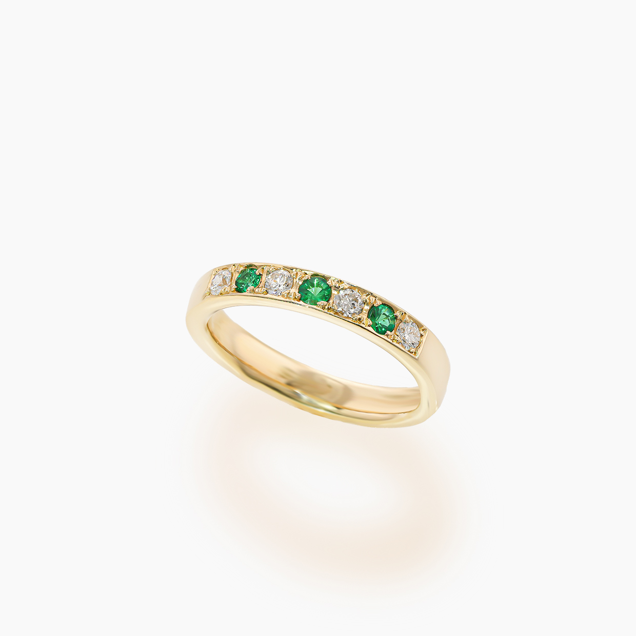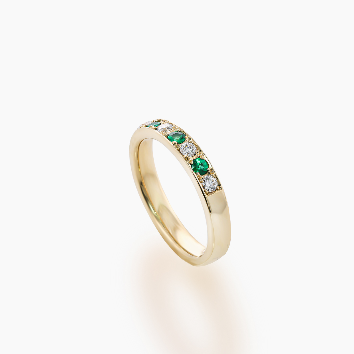 新緑の森を思わせる爽やかなグリーンに、光を受けて水面のようにきらめくラウンドカットのエメラルド。澄んだ輝きのダイヤモンドと交互に並び、まるで昼と夜が寄り添うように、指先に優雅な調和を描き出すK18ハーフエタニティリングが誕生しました。ラウンドカットに仕上げられたエメラルドは、瑞々しい輝きで指先を鮮やかに彩り、煌めきの強いダイヤモンドとのコントラストが洗練された存在感を放ちます。エメラルドは「愛と再生、そして幸運」の象徴。その光は心に癒やしをもたらし、未来へと続く希望を映し出します。そこに永遠の輝きを誇るダイヤモンドが重なり合うことで、時を超えて輝きを放つ特別なリングに仕上がりました。引っかかりの少ないすっきりとしたデザインは、日常の装いに上質な彩りを添え、特別な瞬間には華やかな光をまとわせてくれるリングです。