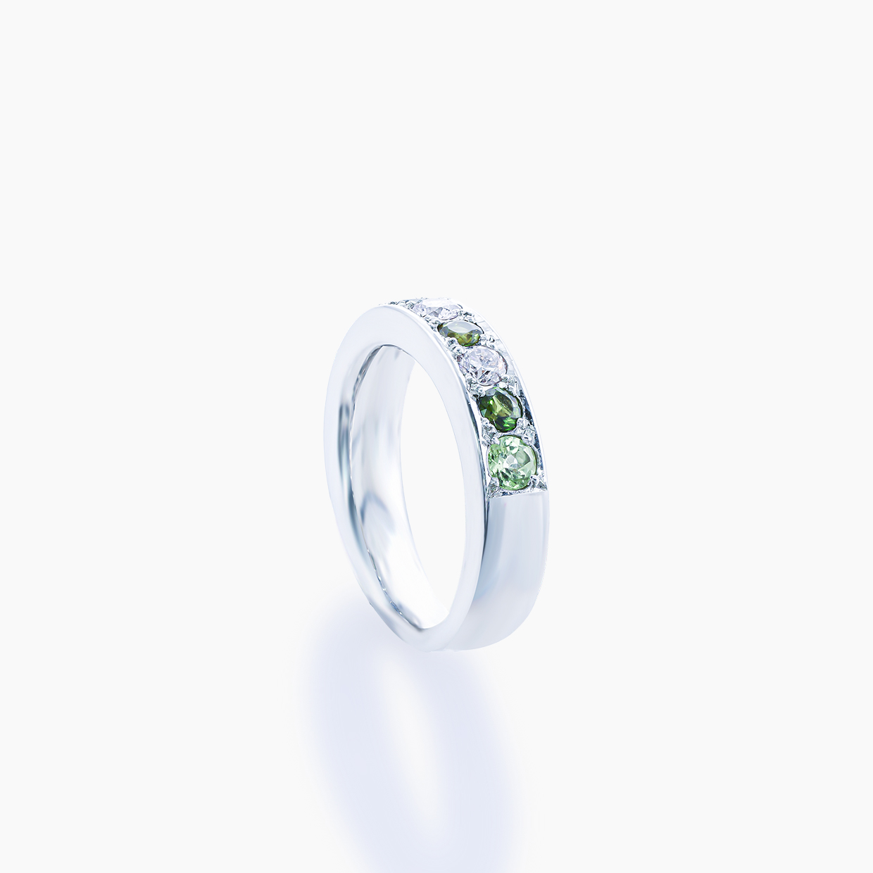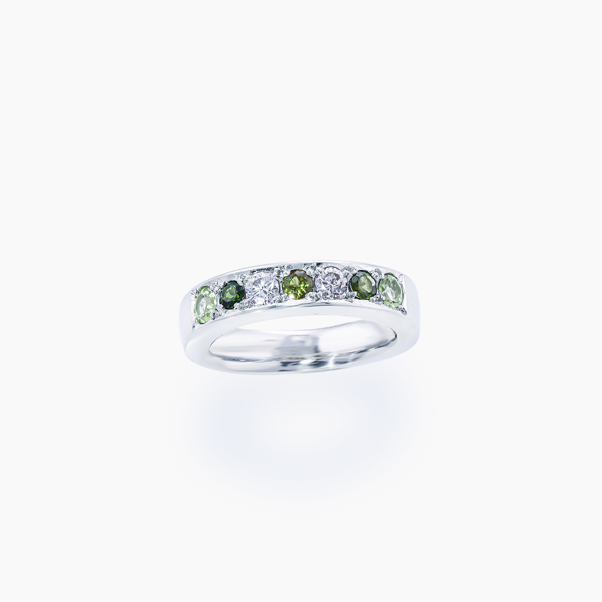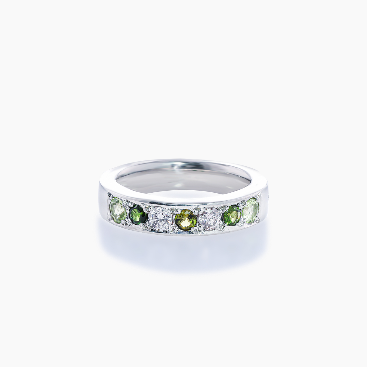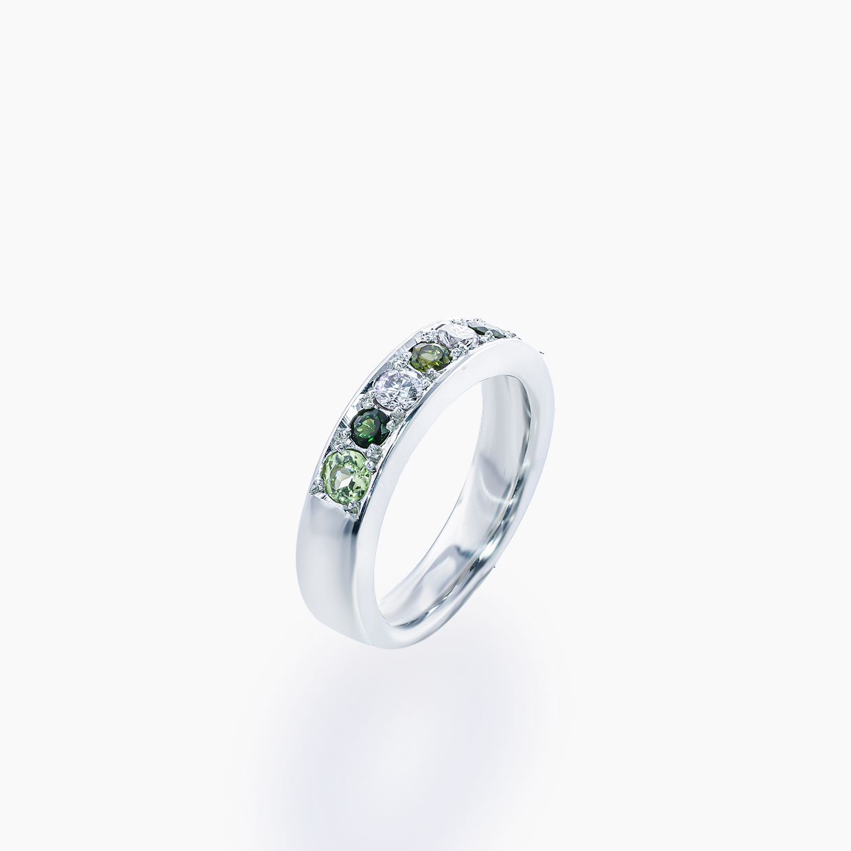 5千年もの歴史をもつガーネットは、古くから人々に愛されてきました。ガーネットというと深い赤をイメージする方も多いと思いますが、実は黄色やオレンジ、緑、紫など様々な色味のある宝石です。これは結晶に含まれる含有元素の違いによるもので、幅広いカラーバリエーションが生まれています。こちらのリングはグリーンガーネットとピンクダイヤモンドを交互に、両端にはペリドットがあしらわれています。リング幅は約4.5mmと普段着けやすく、しかっりとした作りで裏ぬきなどせず指触り良く仕上げています。流れるようなグリーングラデーションの移ろいの中に優しい色味のピンクダイヤが添えられており、まるで早春の里山のような、明るく穏やかで人々の長い歴史、知恵を思わせる一本です。