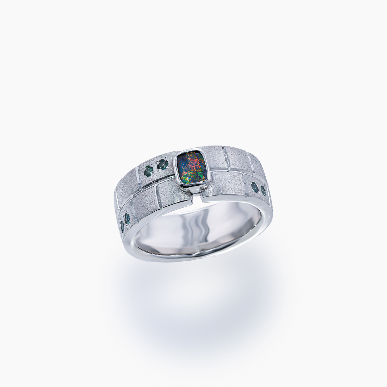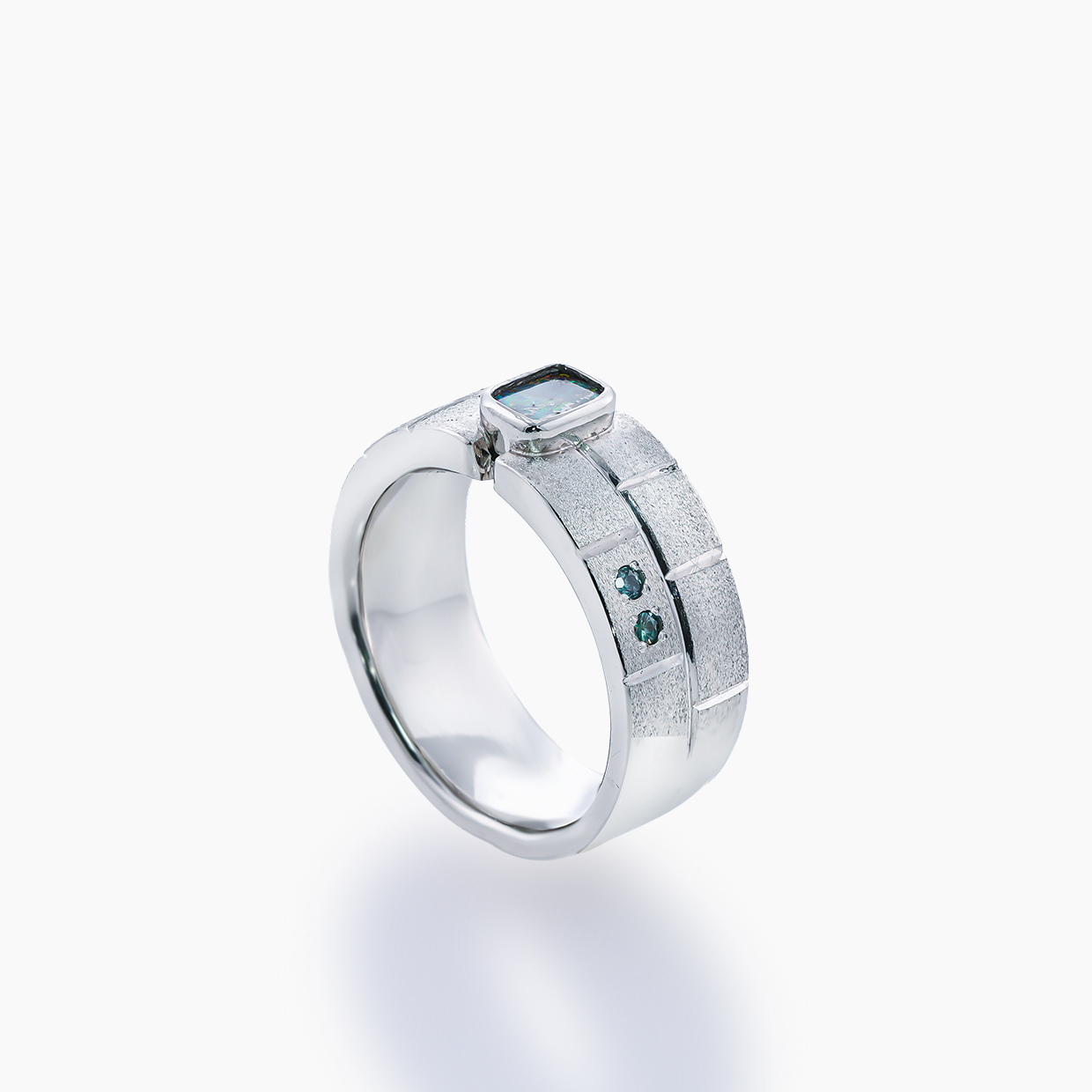 力強さと神秘を同時に宿した、ボルダーオパールのリング。中心に据えられたオパールは、深い宇宙を思わせる黒地に、青や緑の炎が揺らめくように浮かび上がり、唯一無二の存在感を放ちます。その両脇には、光の加減で色を変えるアレキサンドライトが埋め込まれ、知的で鋭い印象を加えています。無駄をそぎ落とした直線的ンデザインとマットな質感の地金は、男性の手元にも自然に馴染み、洗練された個性を演出。強さと美しさを併せ持つこのリングは、自分らしさを貫く大人のスタイルを象徴する一本です。