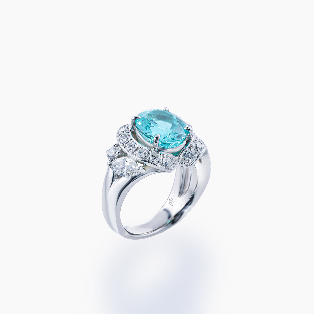 「世界三大希少石」の中でも、別格の存在感を放つパライバトルマリン。今回ご紹介するのは、その中でも「幻」と称されるブラジル産で、2.82ctという極めて稀なサイズを誇る、特別な逸品です。一般的に1ctを超えることすら困難とされるパライバトルマリンにおいて、良質なブラジル産で2ct台後半という大きさは現在の市場でもほとんど目にすることがありません。内側から発光するかのような、ブラジル産特有の力強いネオン感が、この大粒の結晶に余すところなく宿っています。その圧倒的な存在感をさらに引き立てるため、周囲には計1.15ctもの高品質なダイヤモンドを贅沢にあしらいました。重厚感のあるプラチナの枠が、主石のスケール感と鮮烈なブルーを優雅かつドラマチックに際立たせています。南国の海を閉じ込めたかのような、唯一無二のパライバブルー。そのひと目で心を奪われる輝きは、単なるリングの枠を超え、所有する喜びと価値を兼ね備えた一生もののジュエリーとして、確かな存在感を放ち続けます。