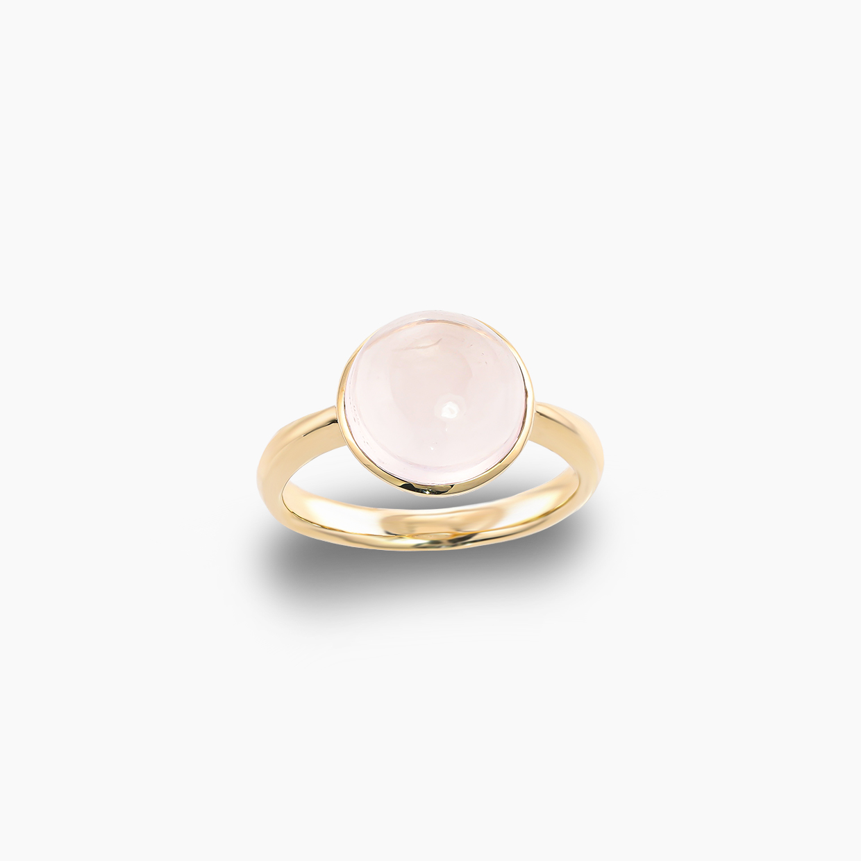 このリングは愛と美を司る石とされるローズクォーツを贅沢な3.92カラットでセットしたリングです。丸みのある優しいフォルムが魅力のカボションカットを施すことで、ローズクォーツの持つ透明感のある淡いピンク色が最大限に引き出されます。まるで満月を思わせるようなふっくらとしたドーム型のローズクォーツからは、肌の上でとろけるような甘く柔らかな光が溢れ出します。シンプルなデザインながらも、イエローゴールドがローズクォーツのフェミニンな輝きを際立たせ、大人の上品なリングになっています。
