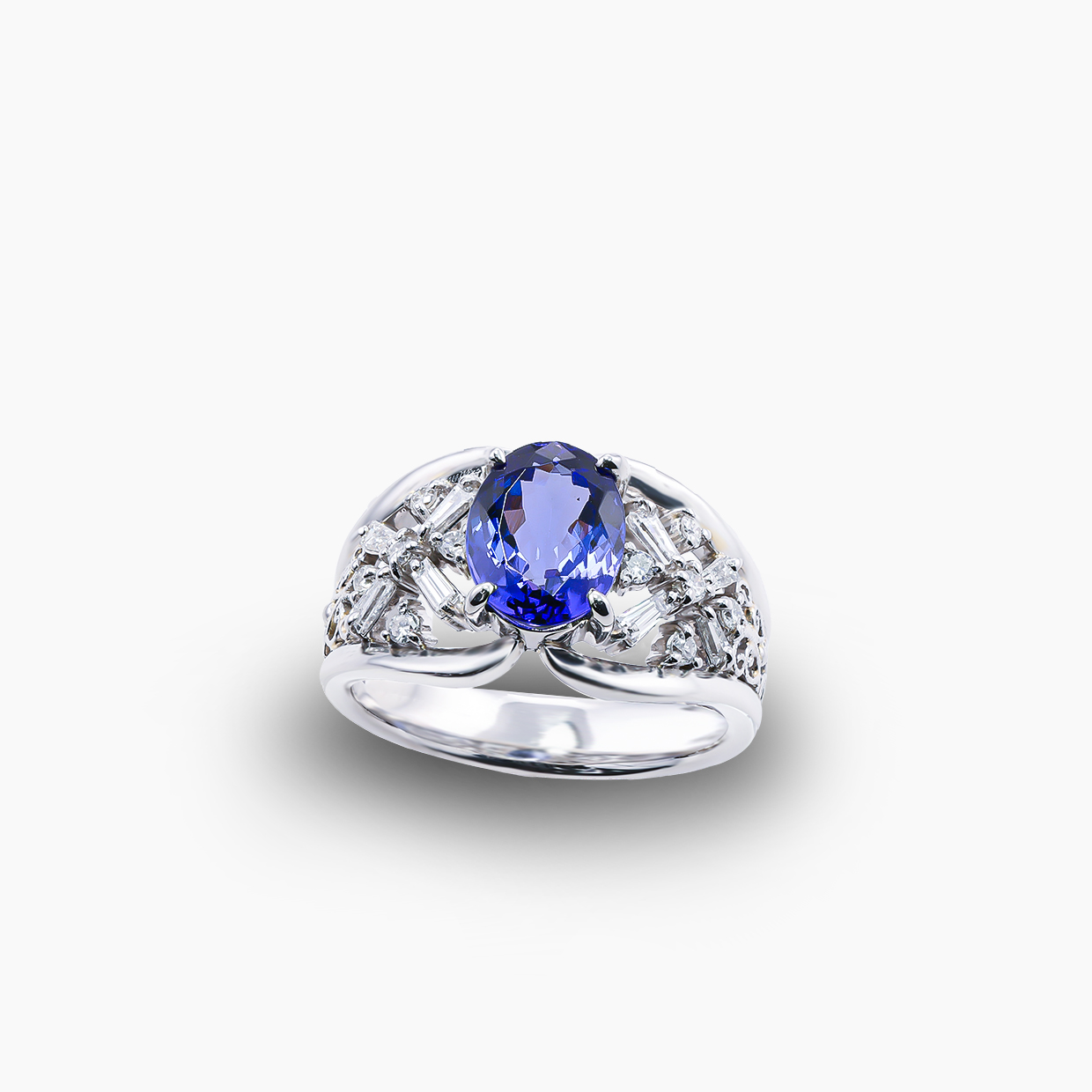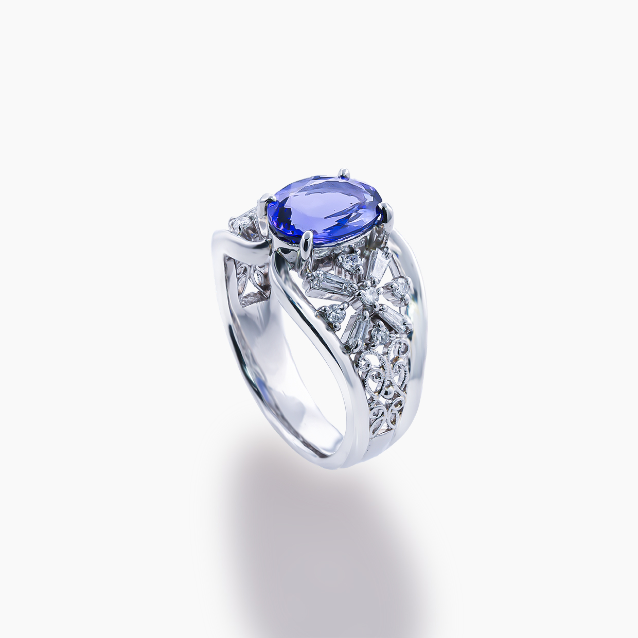 深く澄んだバイオレットブルーが魅力的なタンザナイト。多色性の美しさが際立つオーバルカットのタンザナイトをセンターに配した、気品漂うリングです。タンザニアの夕暮れから夜へと移り変わる、神秘的な空を思わせるその色彩。周囲を彩るダイヤモンドの煌めきは、広大な夜空に瞬く星々のように、静かでありながら確かな存在感を放ちます。モダンなバケットカットのシャープな輝きと、メレダイヤの繊細な煌めきが織りなす立体的なフォルムは、まるで指先に宿る小宇宙。洗練されたボリューム感を備えつつ、透かしを取り入れたデザインにより、軽やかで優美な手元を演出します。時を重ねるほどに愛着が深まる、一生ものにふさわしい価値あるコレクションです。