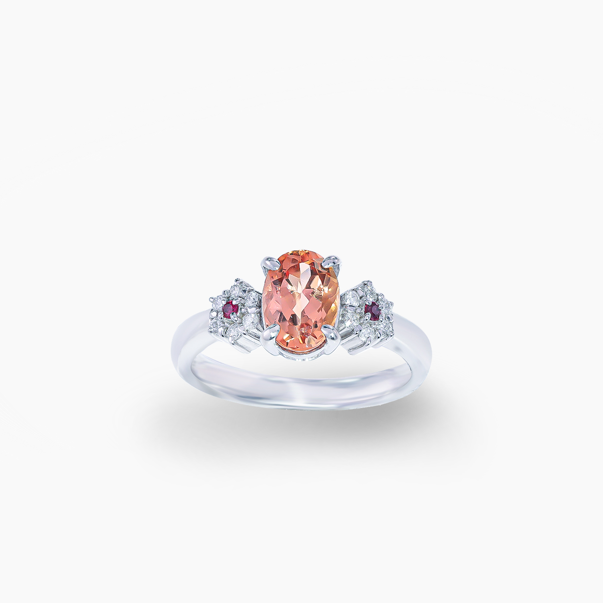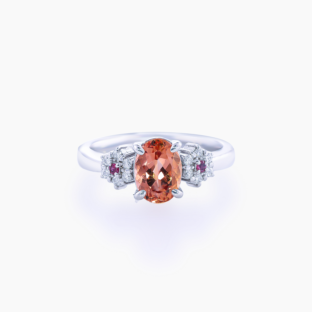 柔らかな黄金色にオレンジの輝きを溶け込ませたインペリアルトパーズに、鮮やかなルビーを添えた華やかなリングです。皇帝の石と呼ばれるインペリアルトパーズは、上品で温かみある色彩が魅力。その深い輝きに、情熱を象徴するルビーの鮮烈な赤を重ねることで、凛とした個性と華やかさを兼ね備えたデザインに仕上がりました。さらに、繊細にセッティングされたダイヤモンドが光を受けてきらめき、二つの宝石の美しさをより一層引き立てます。インペリアルトパーズは「希望・友情・誠実」、ルビーは「情熱・愛情・勇気」という石言葉を持ち、互いに響き合うように身に着ける人を力強く輝かせてくれます。インペリアルトパーズの優雅さとルビーの華やかさが織りなす、唯一無二のコンビネーション。自分らしい魅力を引き出す、特別な一本です。